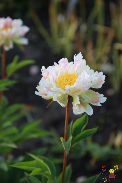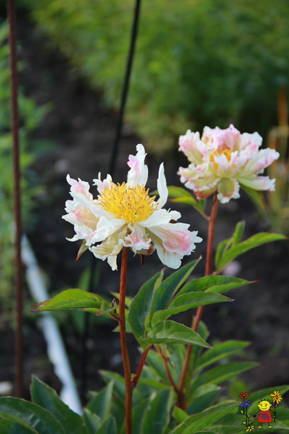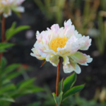 ziedi balti ar zaļu un rozā nokrāsu, puspildīti, neregulāri, VI